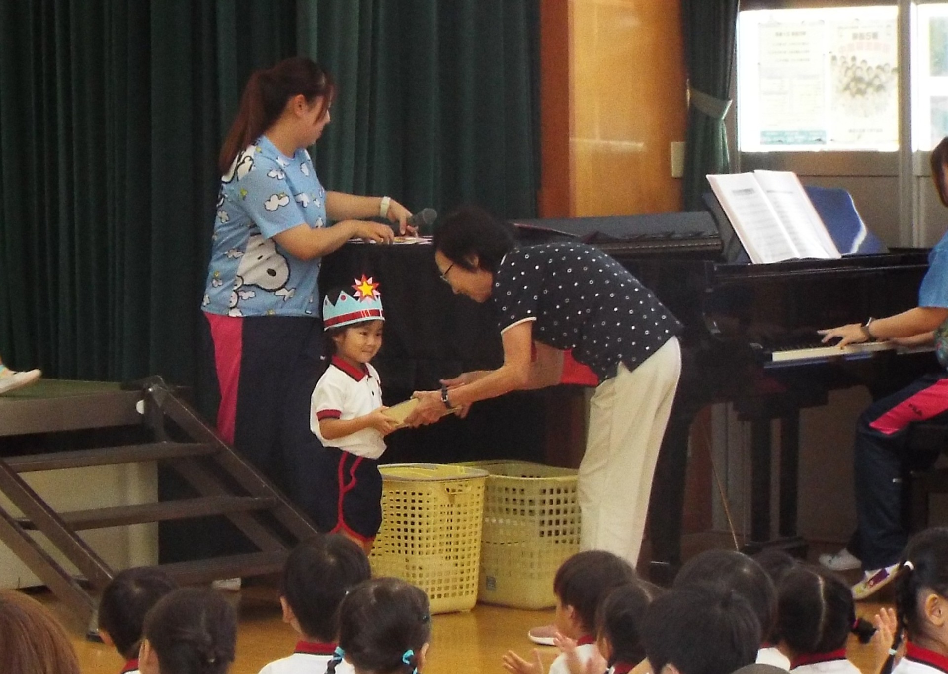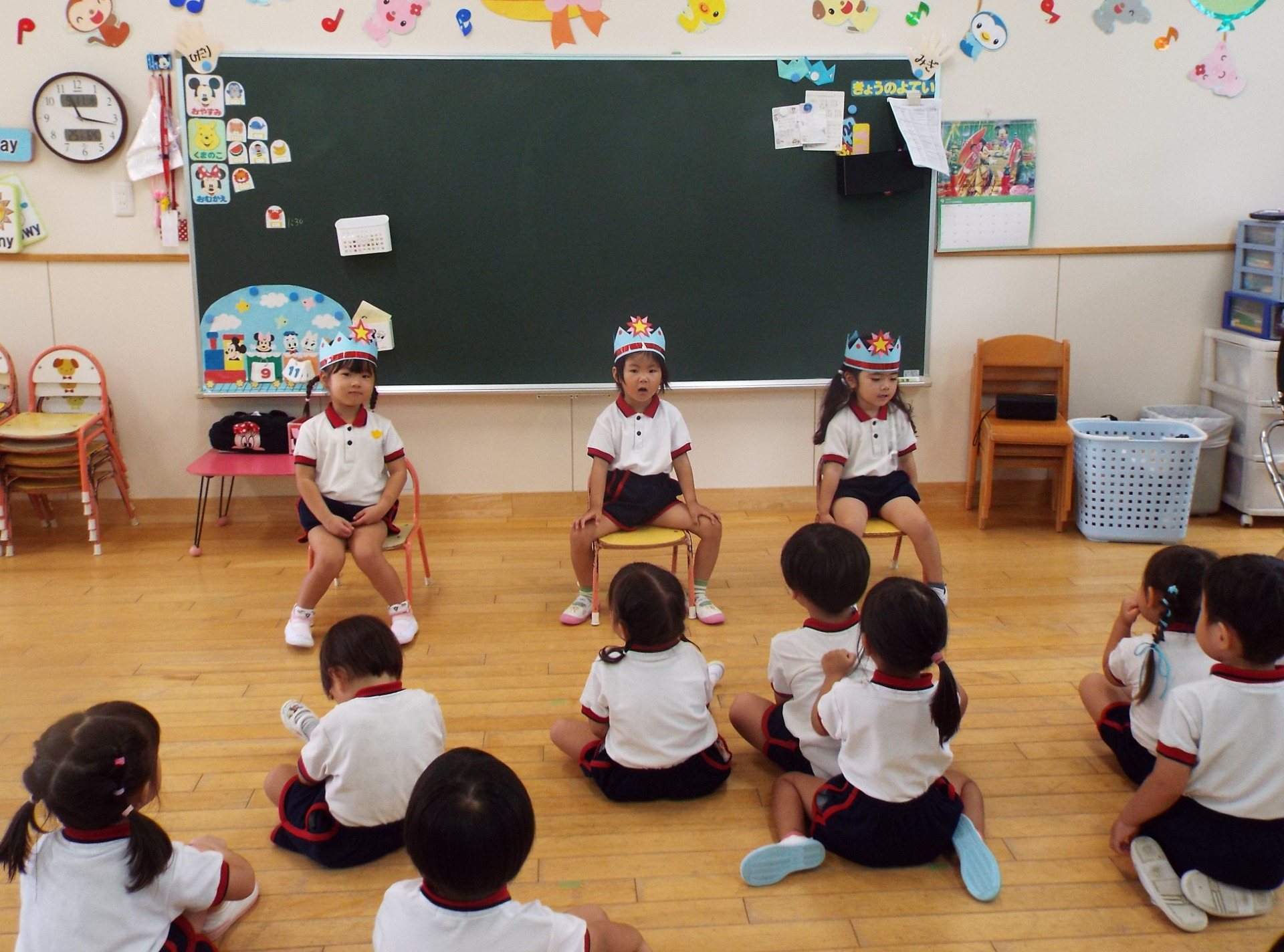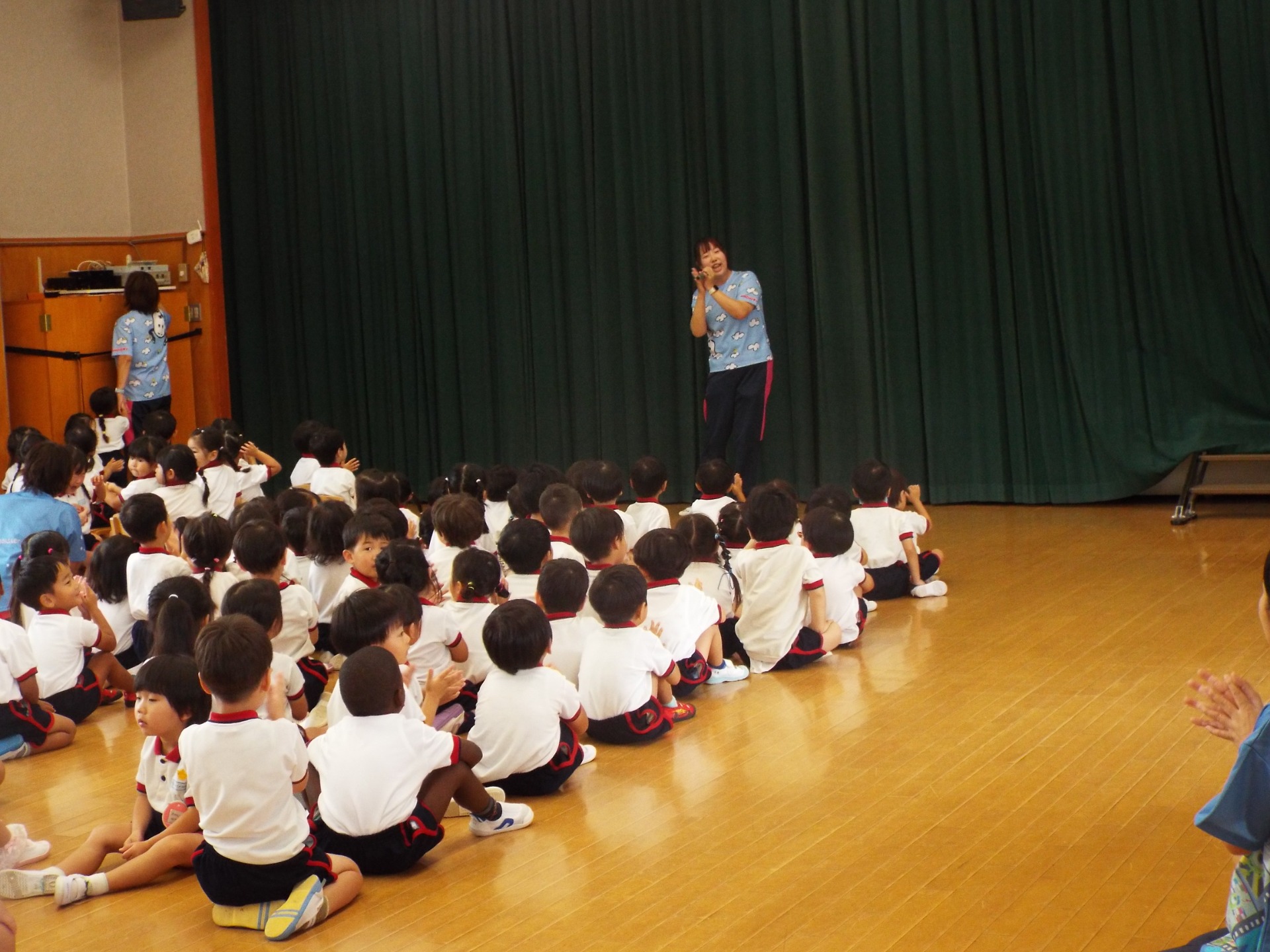 今日は8・9月生まれの満3歳と4歳になる17人の誕生会でした。1人ずつ、なまえを呼ばれると「はーい!」と全員元気に手を挙げて、大きな声で返事が出来ました。