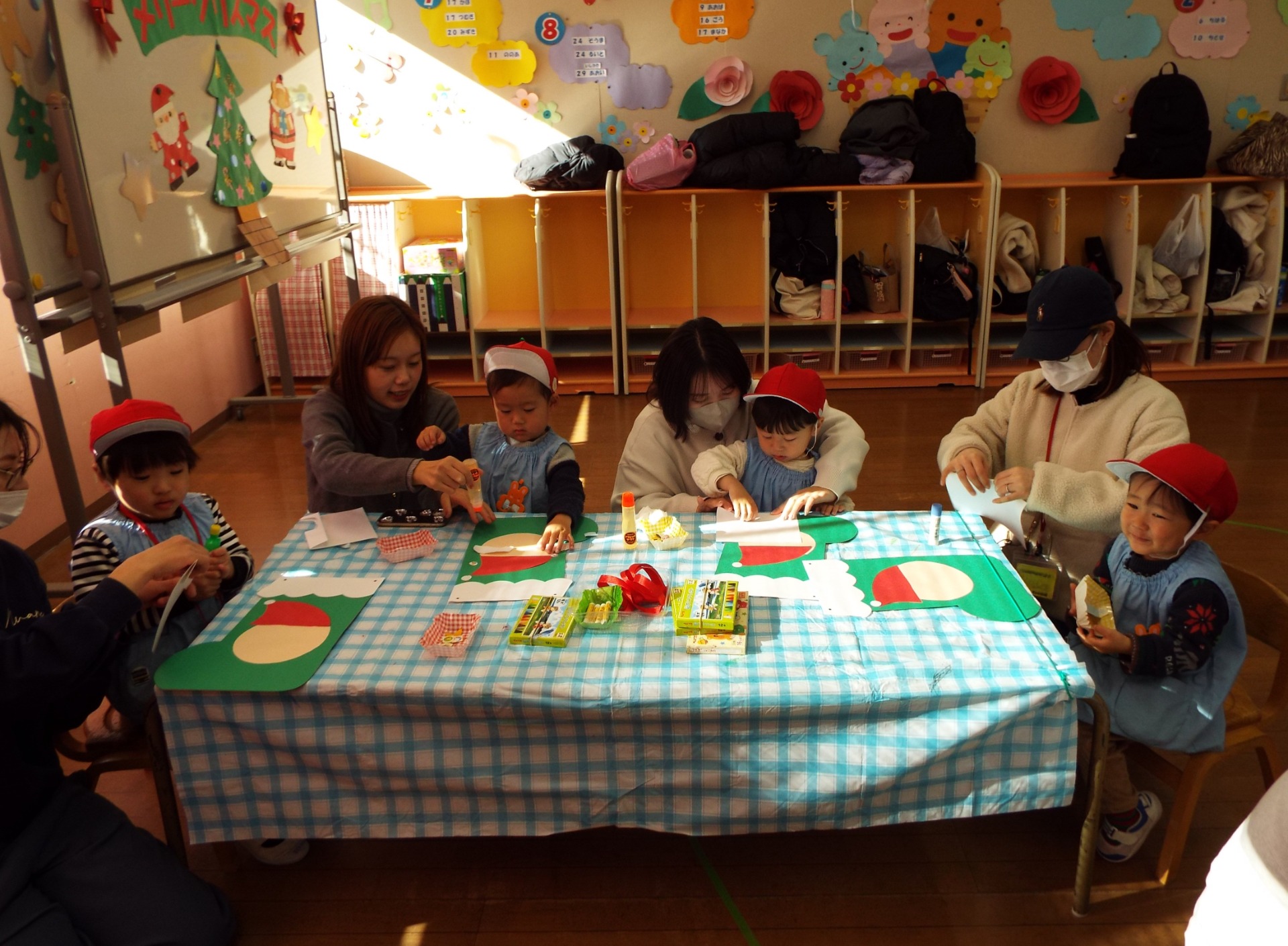 クリスマスプレゼントを入れるブーツの作成です。みんなどんな顔のサンタさんブーツが出来上がるかな?