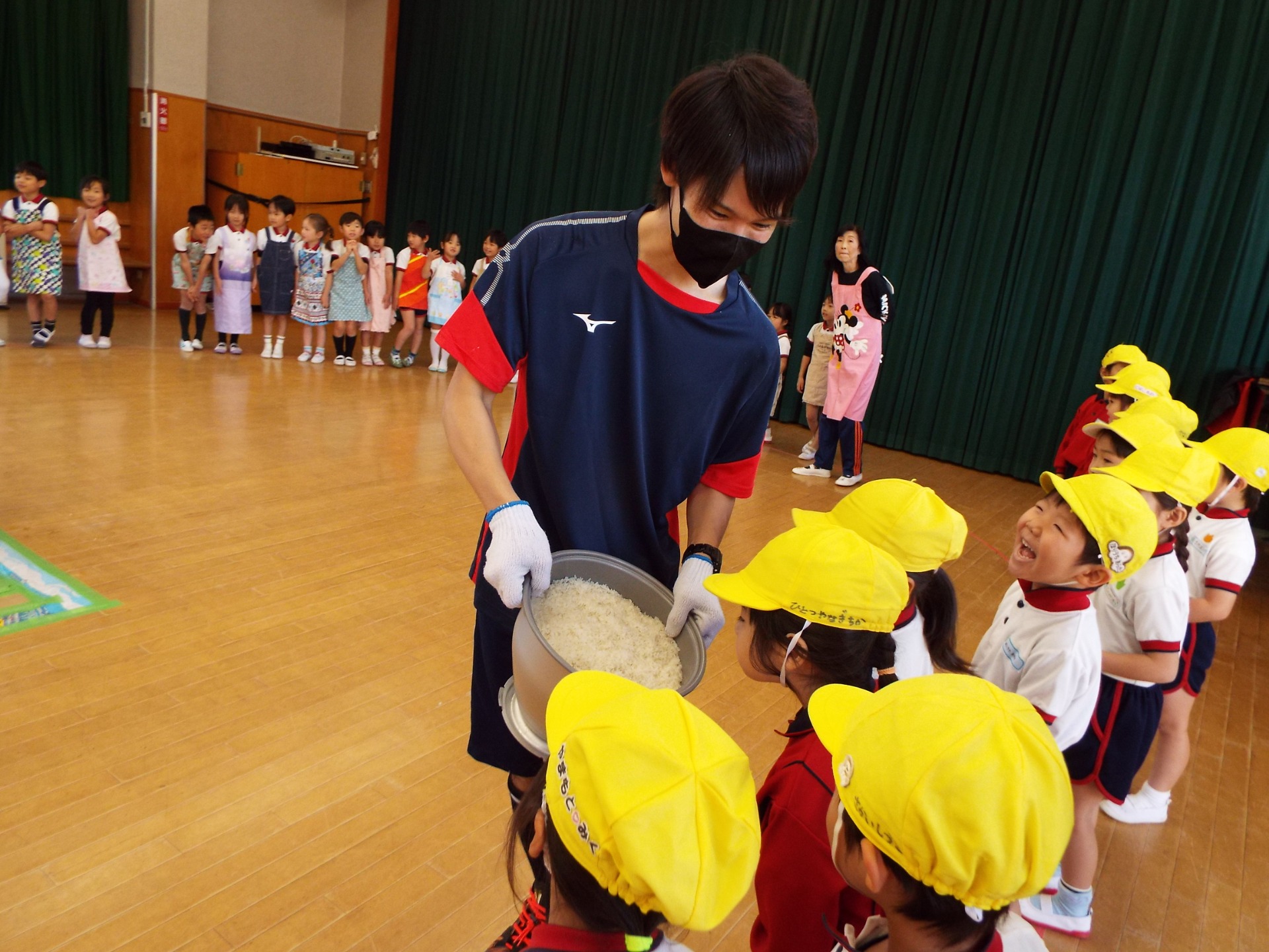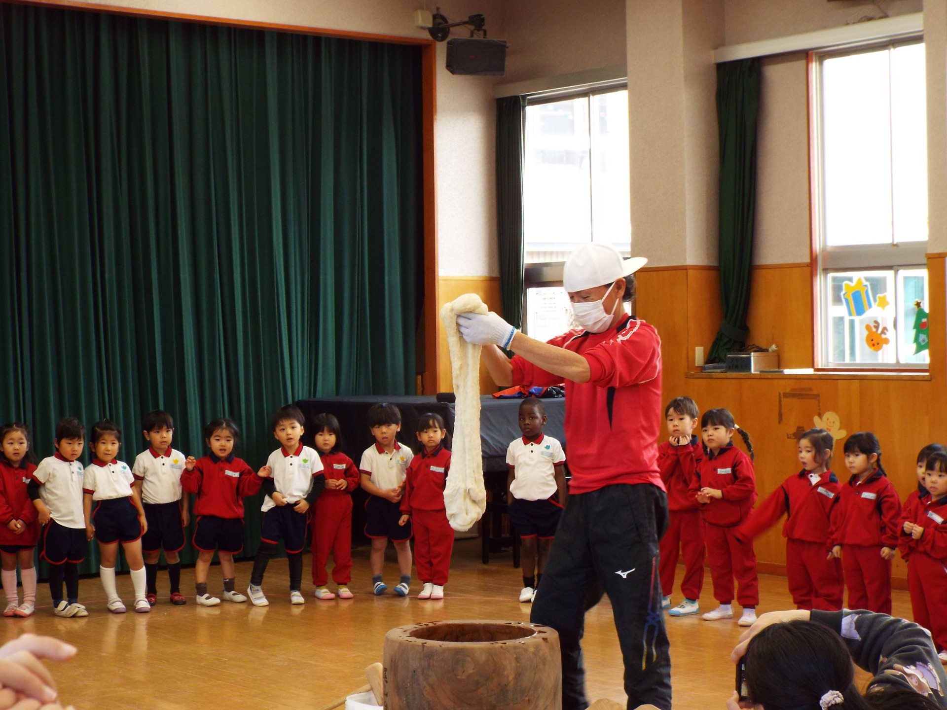 体操の先生たちでお餅をついていきます!子どもたちの「がんばれー!」「よいしょー!」という応援が、先生たちのパワーになります!