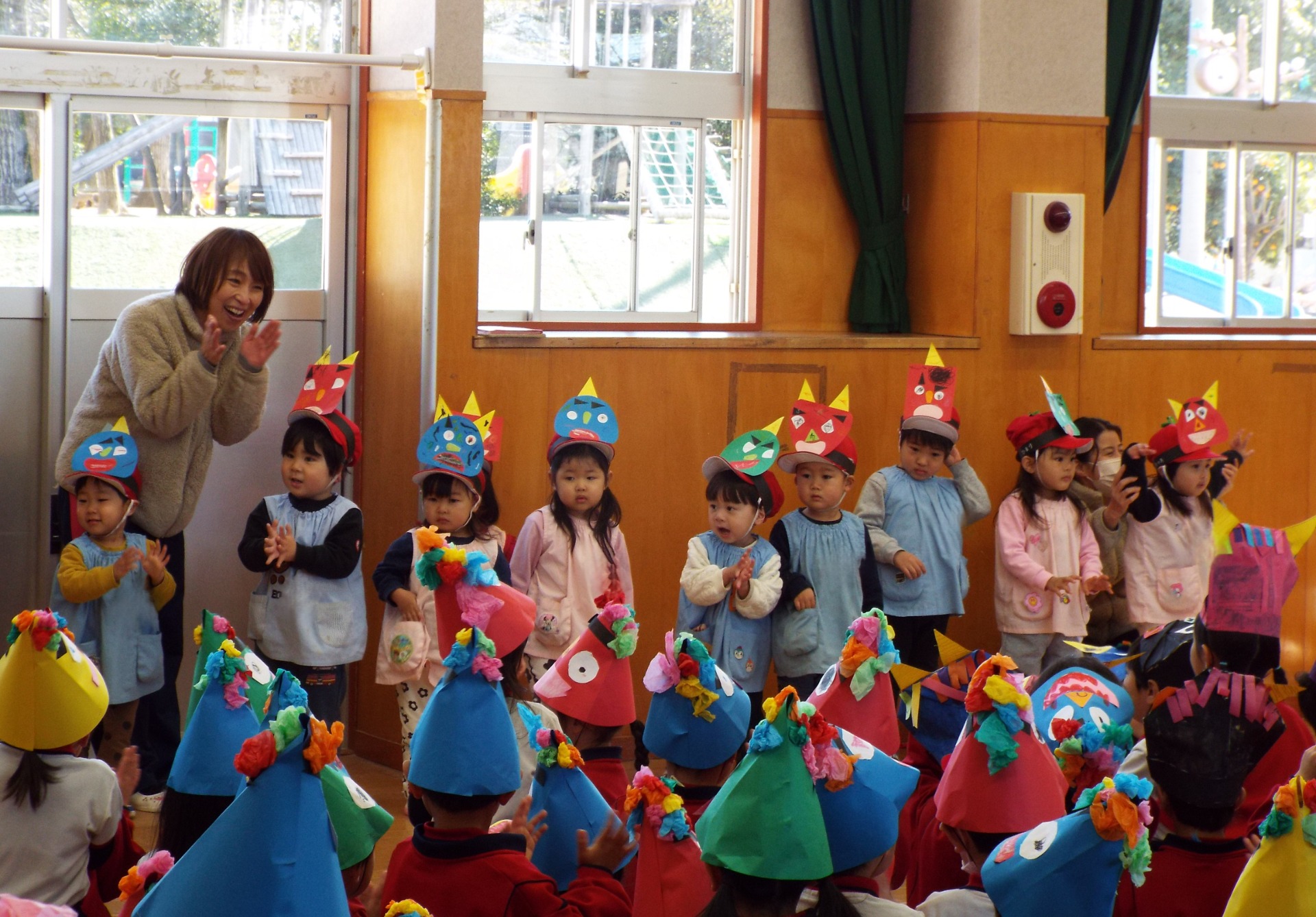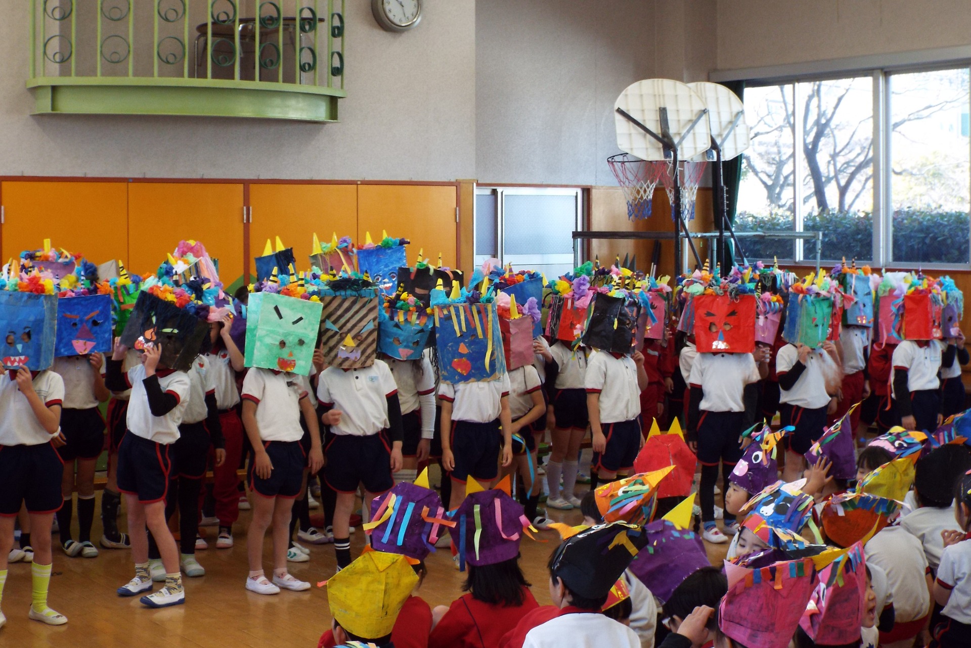 きょうは節分です。日本古来の行事です。尾山台幼稚園では節分クイズをしたあと、自分たちで作ったお面をそれぞれの学年ごとに披露しました。