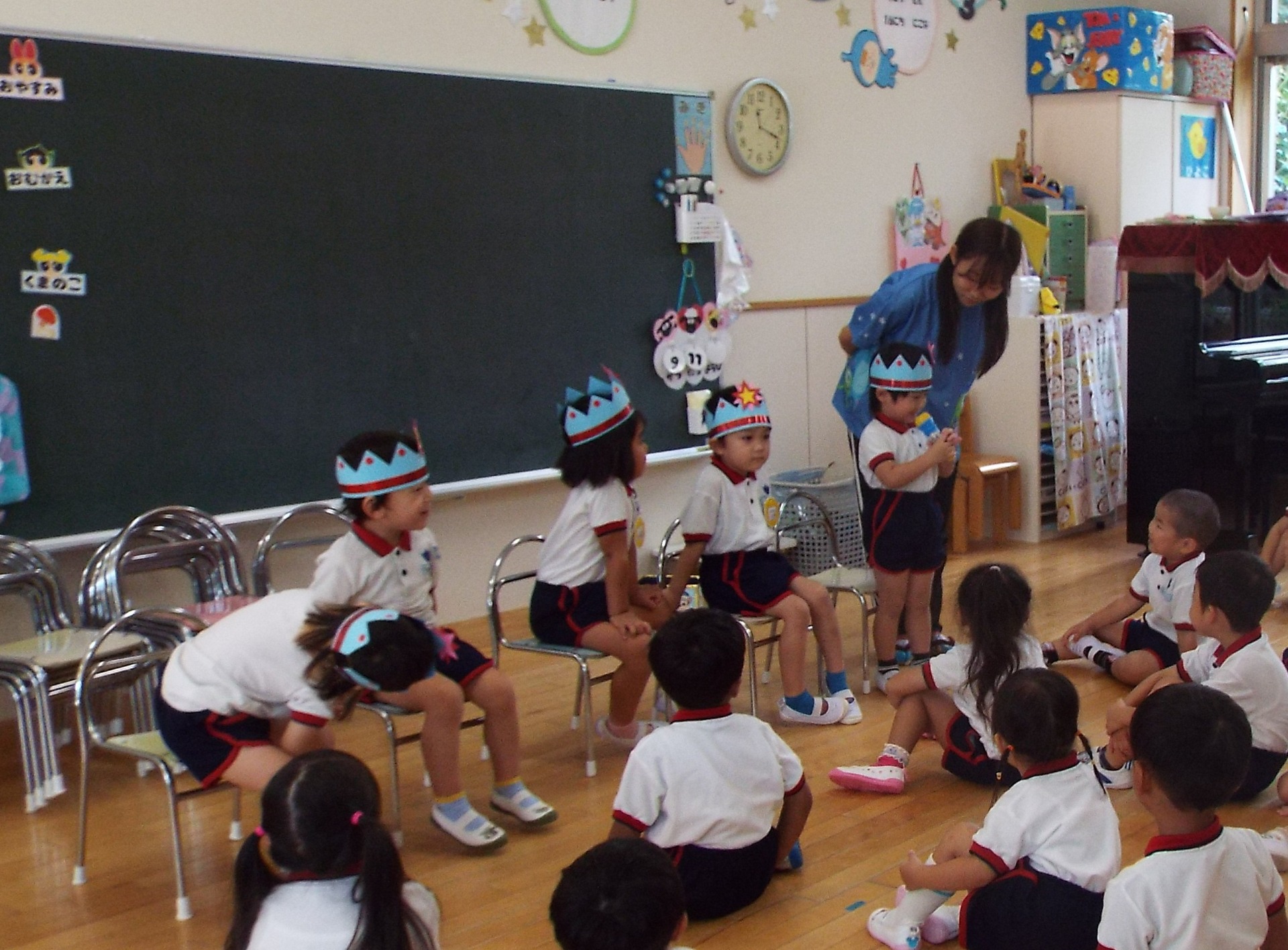 今日は8・9月生まれの満3歳と4歳になる17人の誕生会でした。1人ずつ、なまえを呼ばれると「はーい!」と全員元気に手を挙げて、大きな声で返事が出来ました。