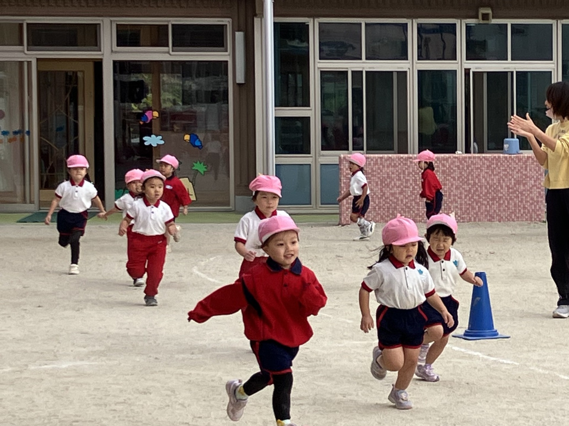 年少組は園庭を2周走ります。2歳児クラスのみんなも応援してくれました。