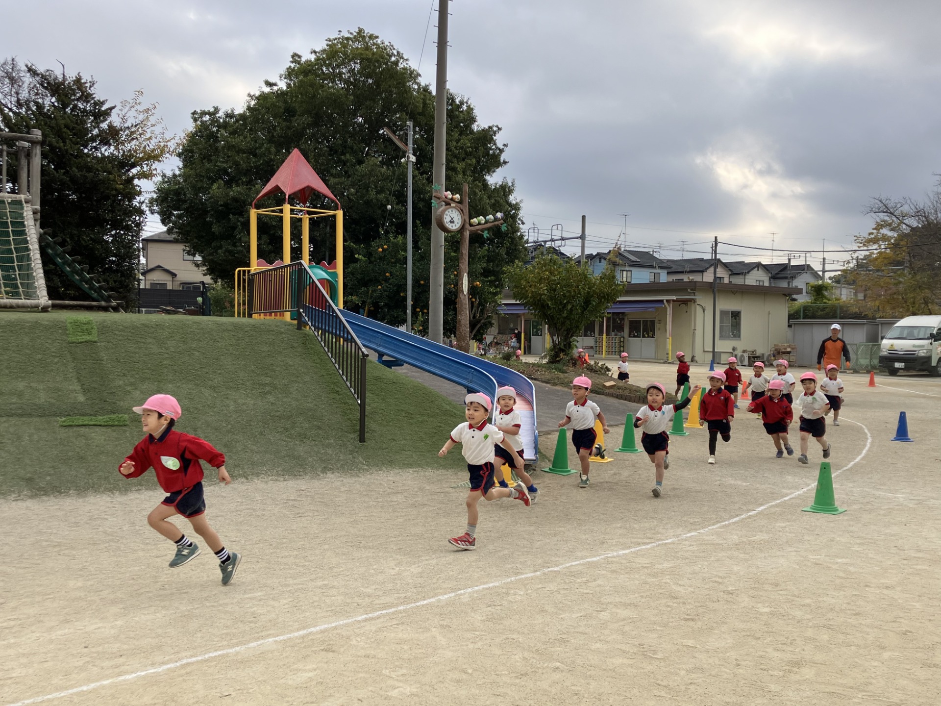 今日は年少組のマラソン大会でした。スタートする前に「エイエイオー!」とやる気満々の子どもたち!