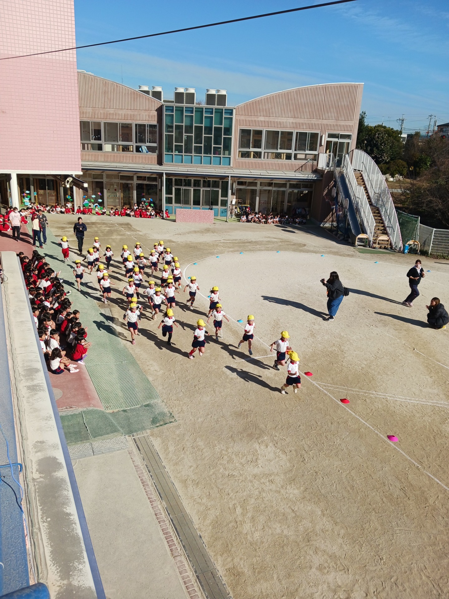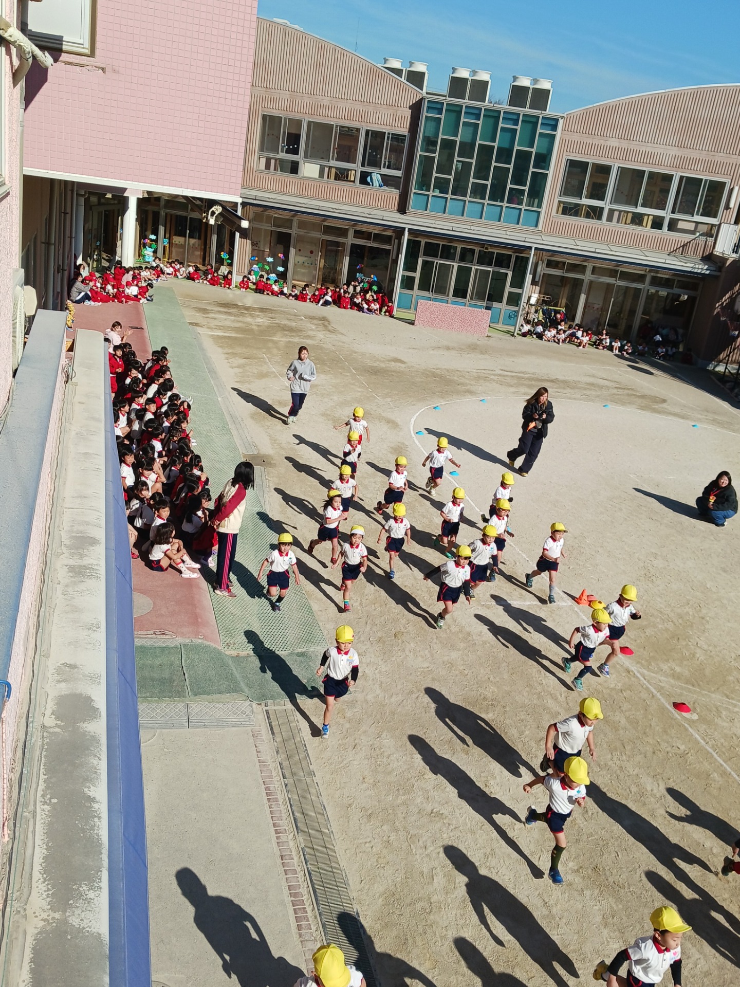 今日は年中組のマラソン大会が行われました。澄み切った青空の下、川北先生と元気に体操をしたら、いよいよ女の子からスタートです!
