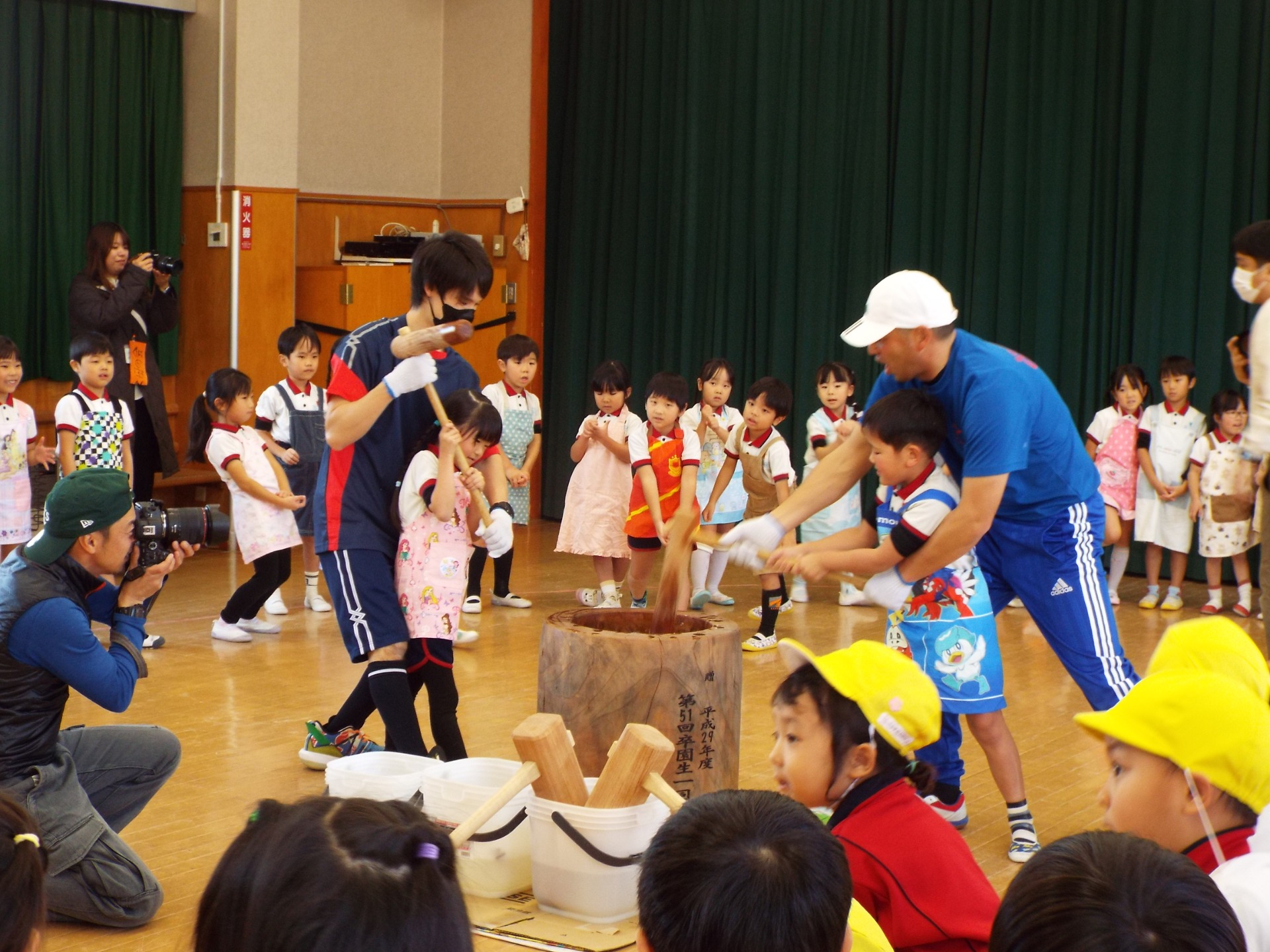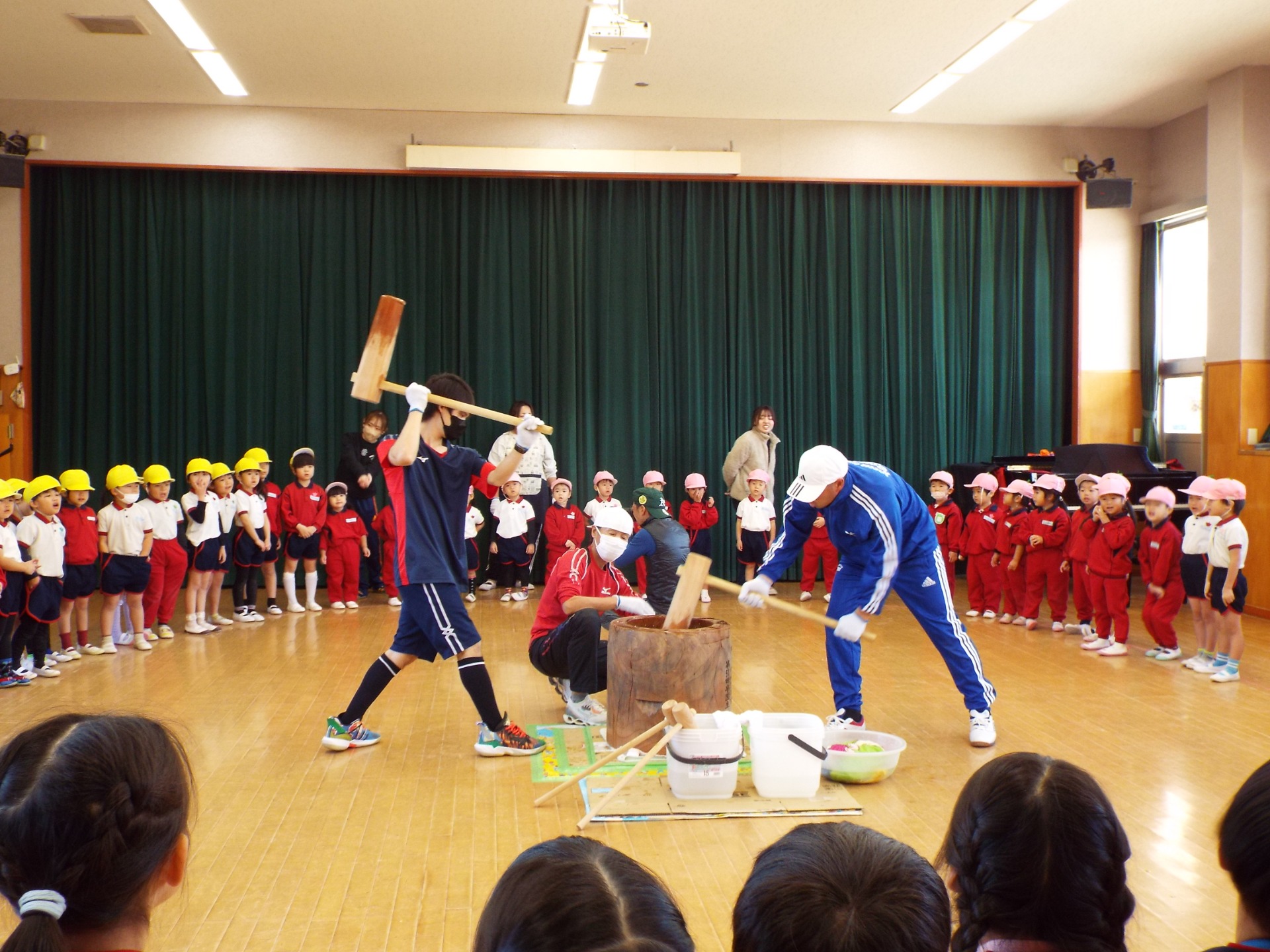 体操の先生たちでお餅をついていきます!子どもたちの「がんばれー!」「よいしょー!」という応援が、先生たちのパワーになります!