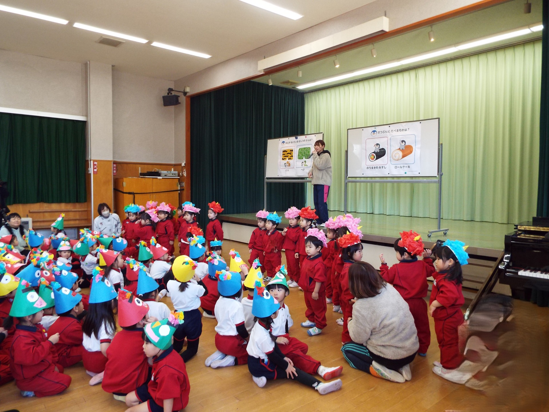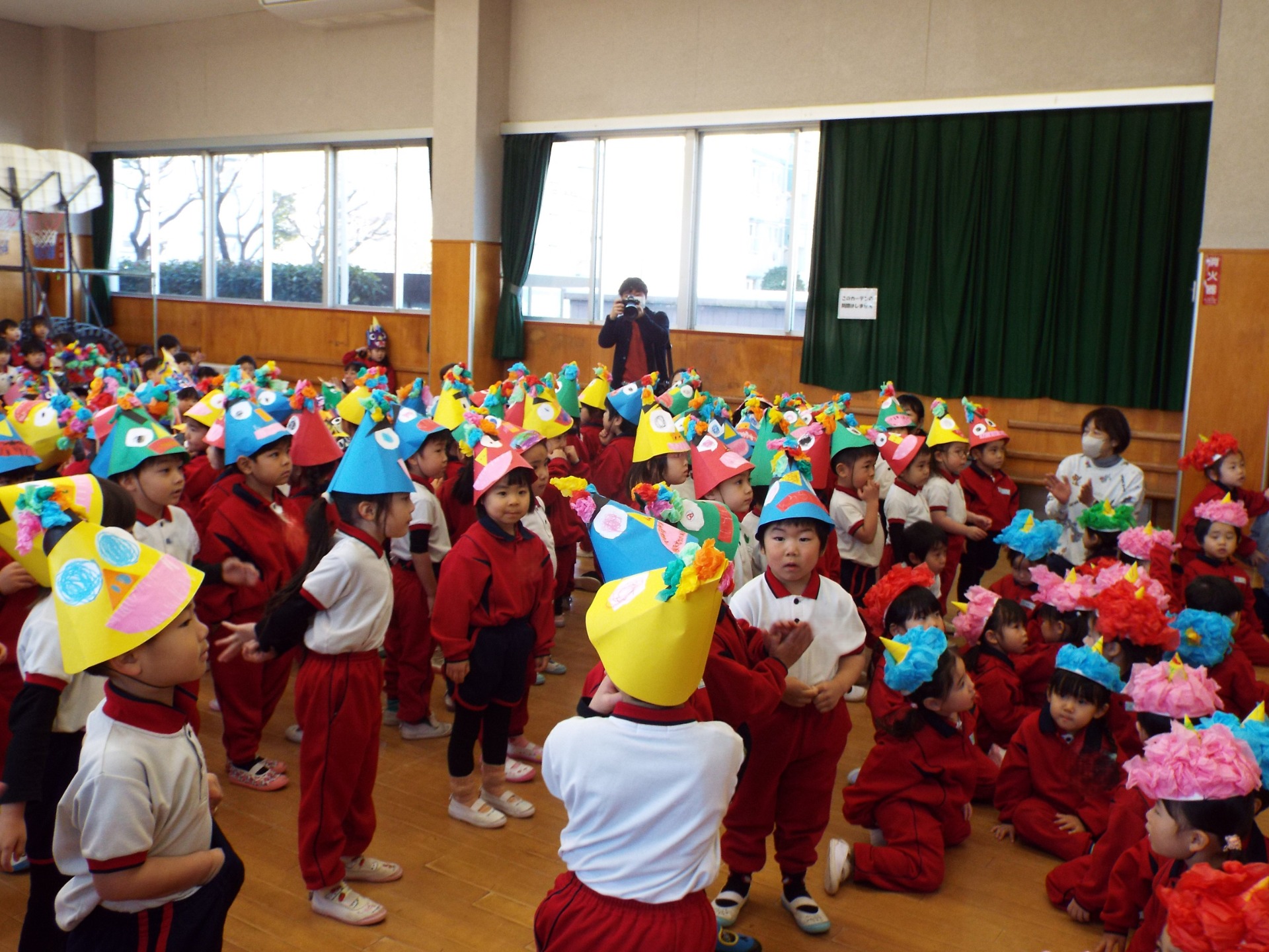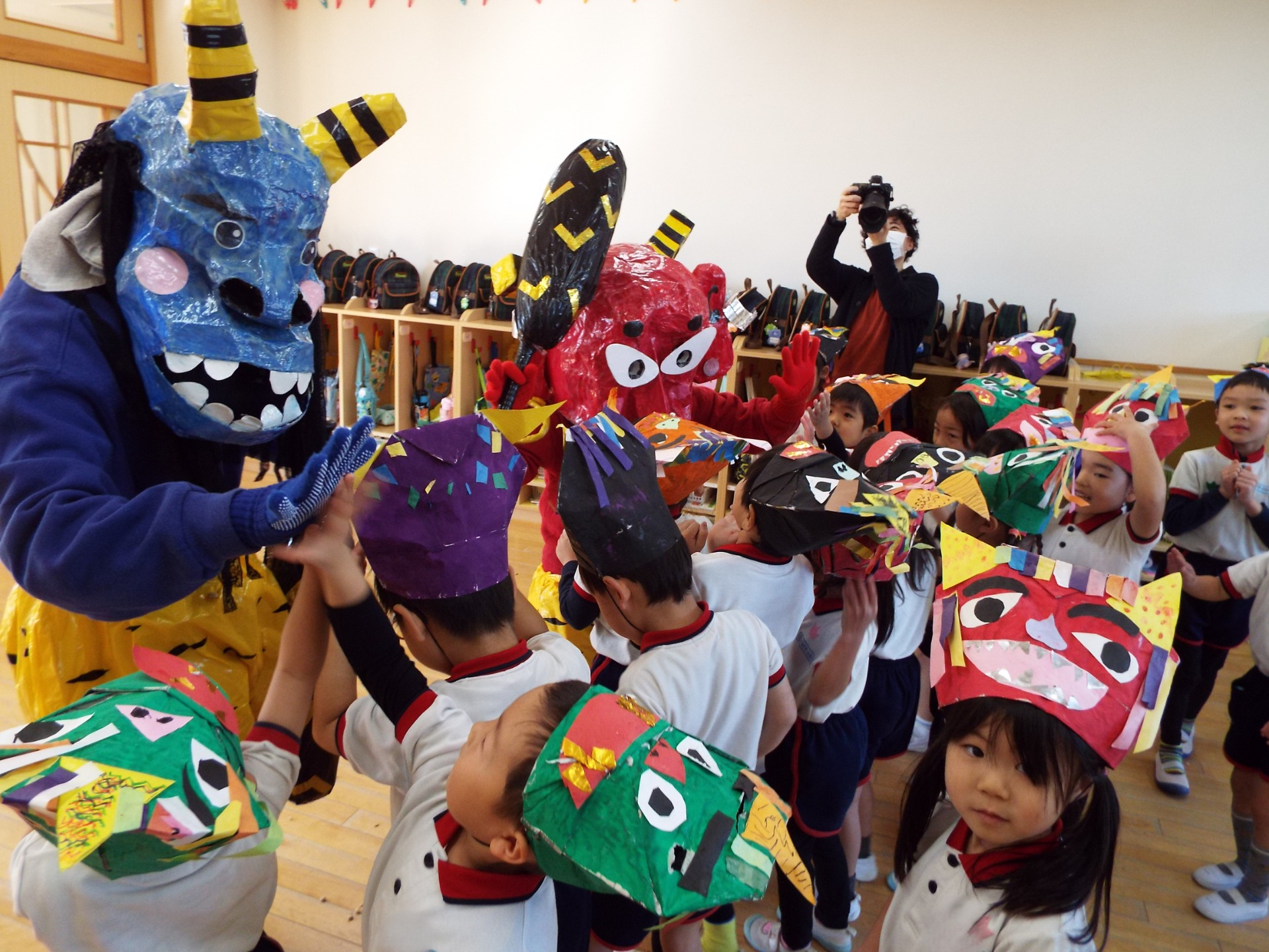 きょうは節分です。日本古来の行事です。尾山台幼稚園では節分クイズをしたあと、自分たちで作ったお面をそれぞれの学年ごとに披露しました。