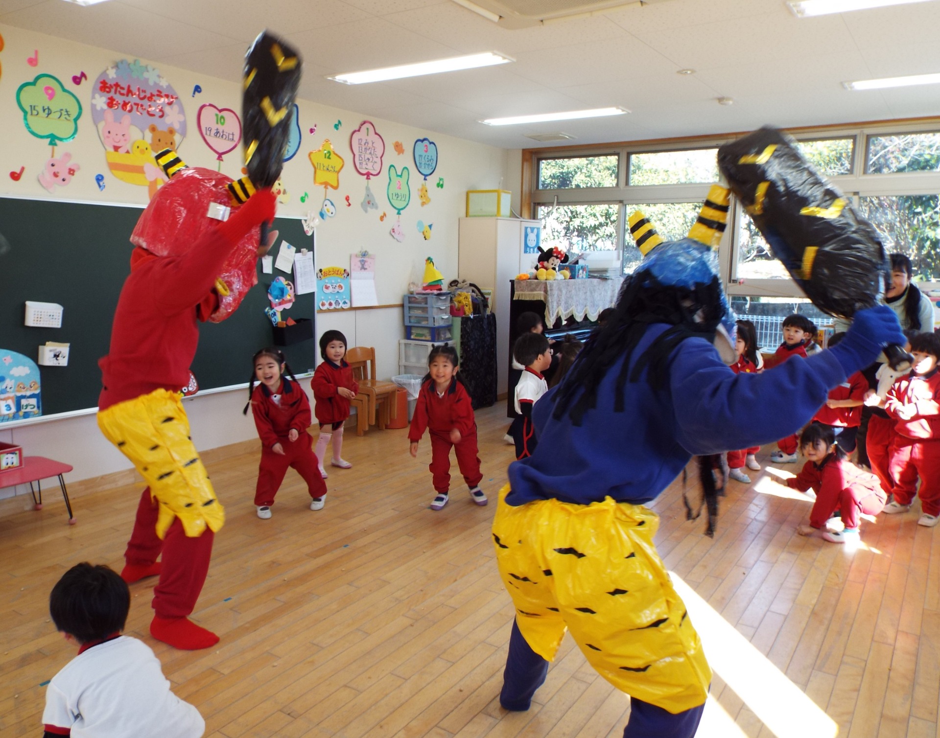 幼稚園中が「鬼は外」「福は内」と大声出して、豆を投げて、鬼退治!!