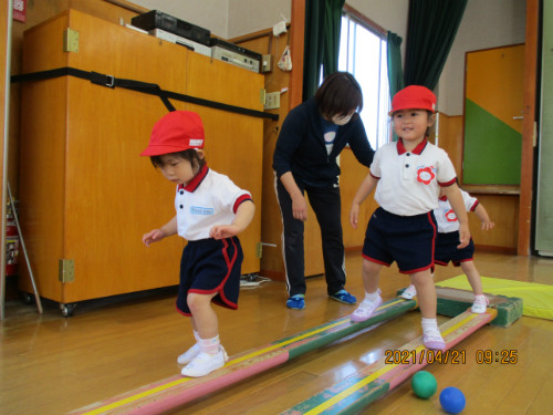 今日は、大小さまざまなボール、平均台、トンネルなど、楽しそうな遊具を使っての活動でした。
